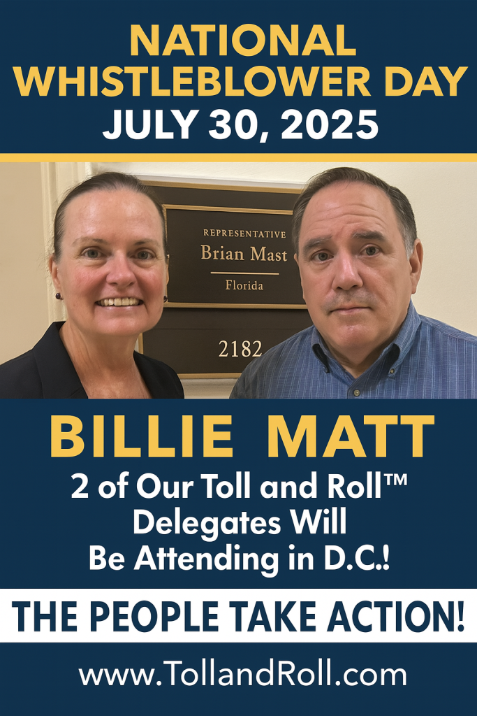 Our Delegates: Toll and Roll TM Co-Founders are John Bloom and Billie Powers, and their DC Delegate team includes: Tom Kibler, Matt Skarlatos, Rod Class, Tea Hogan, Irene Reichenbach, Kathleen Arthur and Kirk Pendergrass. The team with millions of victims, thousands of advocates and hundreds of whistleblowers and all the People behind them!