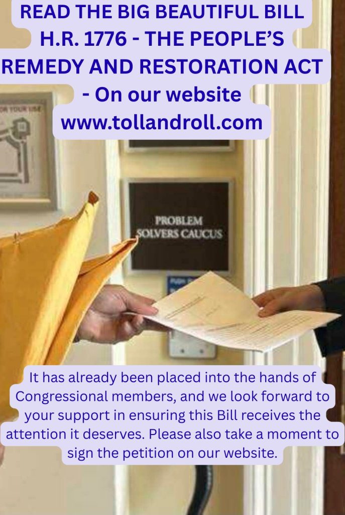 Call your representatives, share the Toll and Roll TM documents, the purposed bill and let them know, “the People are getting business done, the right way!”