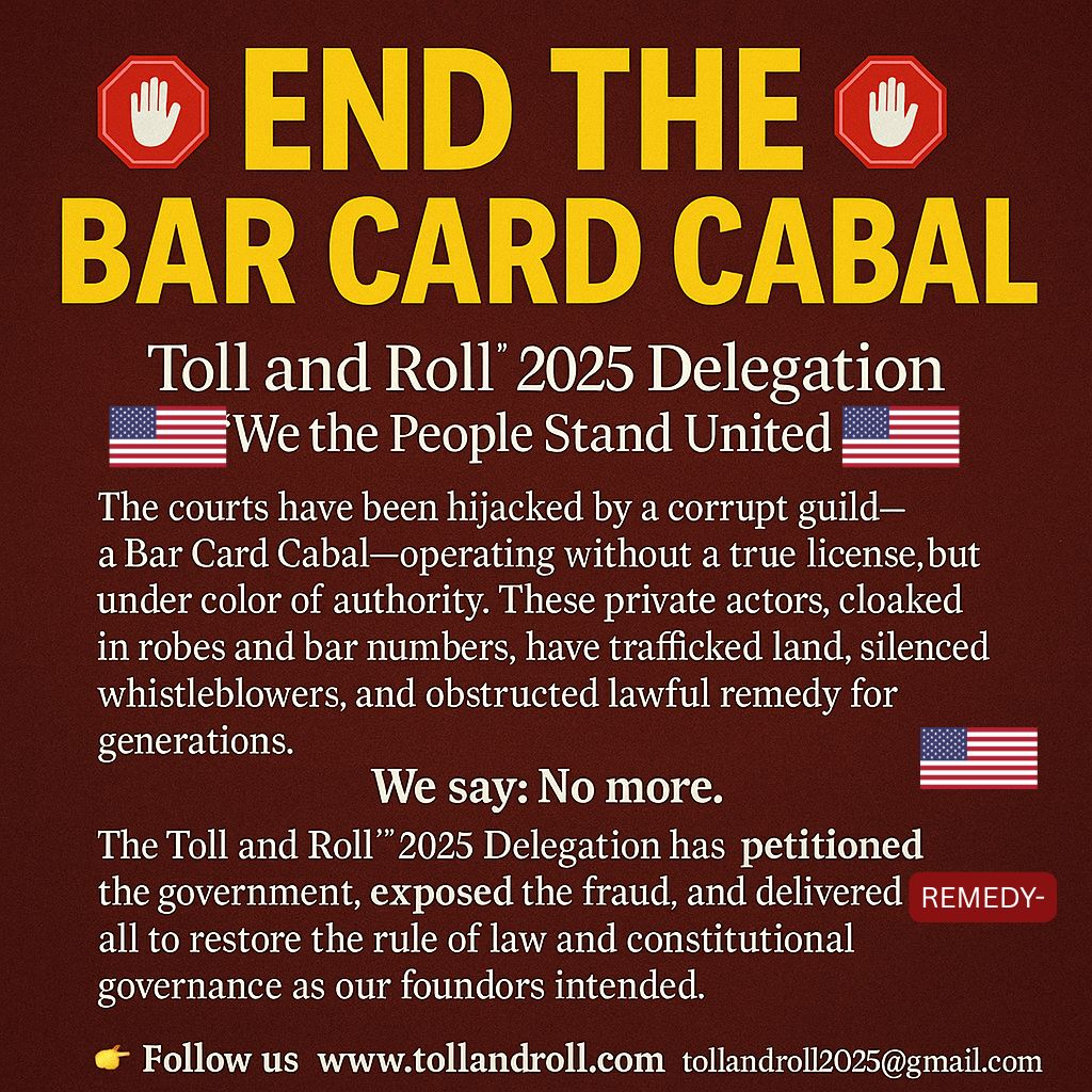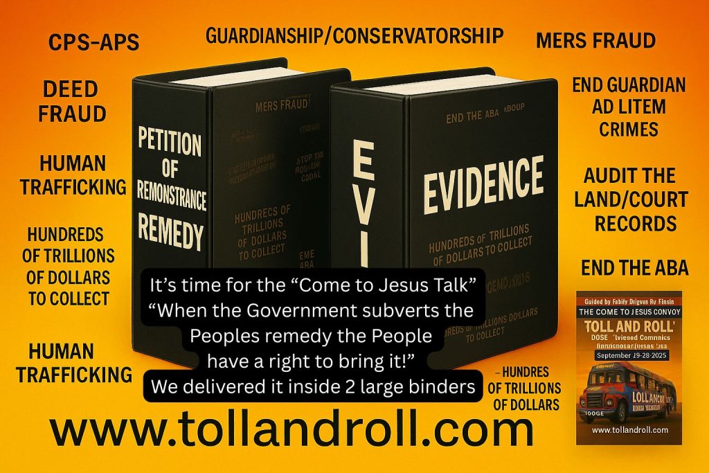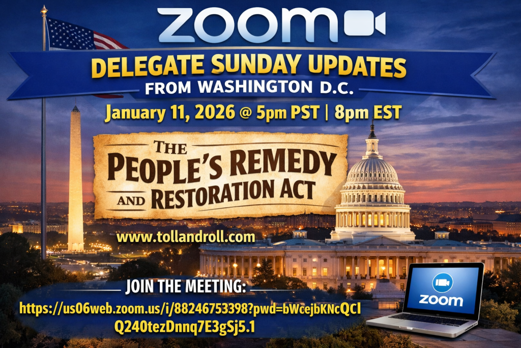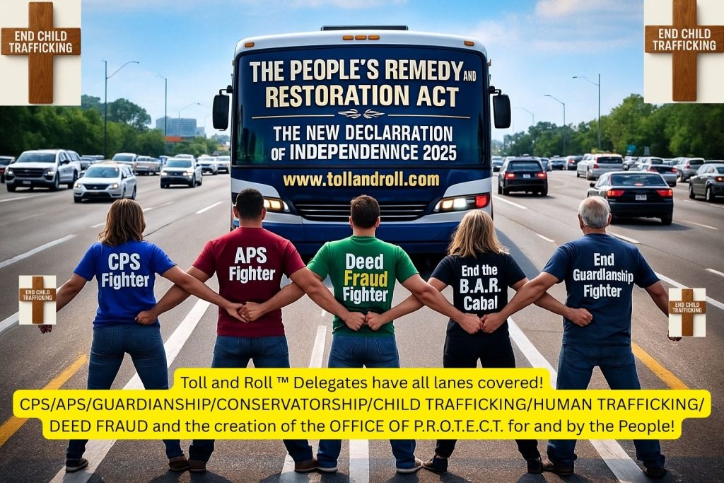 The Delegates seek the remedy for property titles being restored to rightful owners of title and for them to receive treble damages. They seek the return of children to their families and seniors to be taken out of isolation. Damages are tolling, hence the name Toll and Roll!