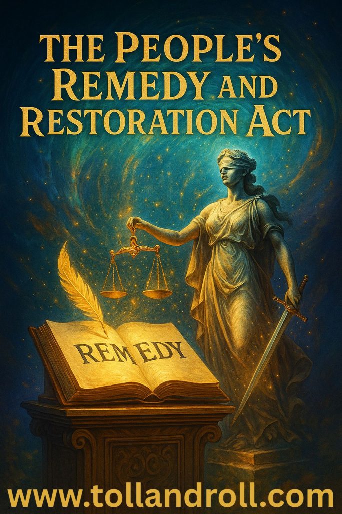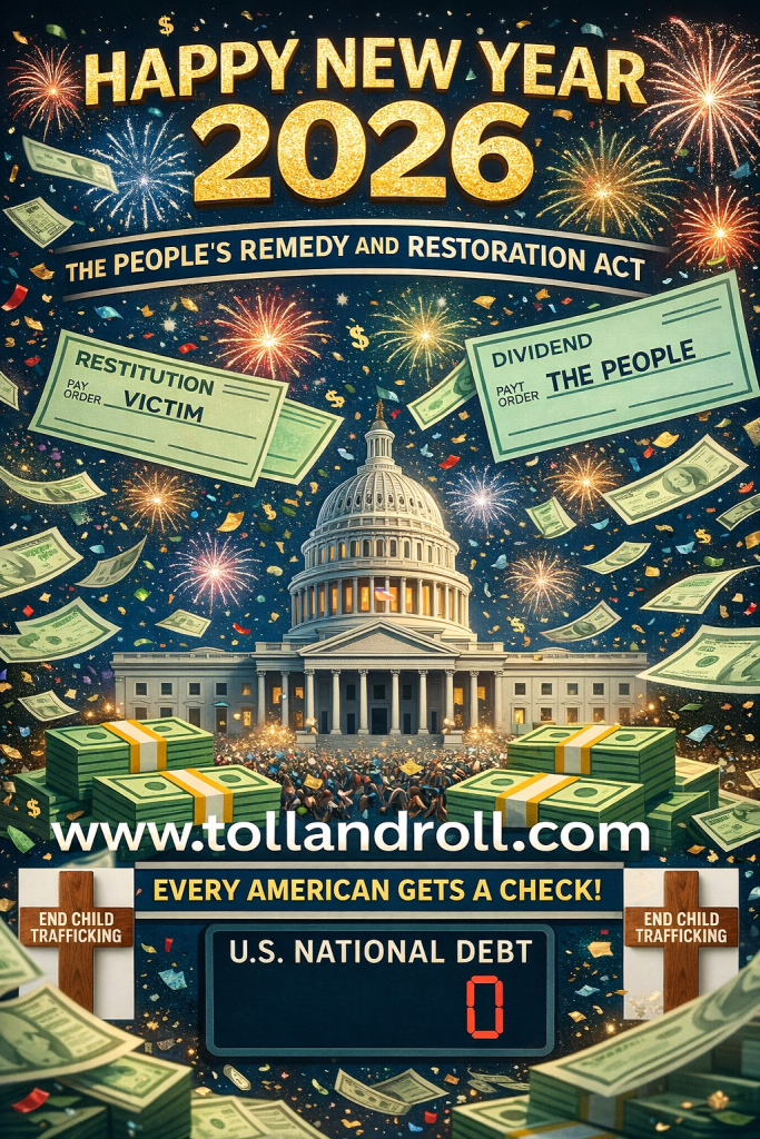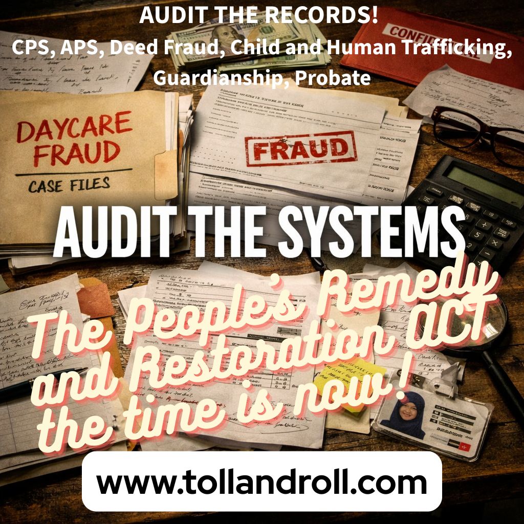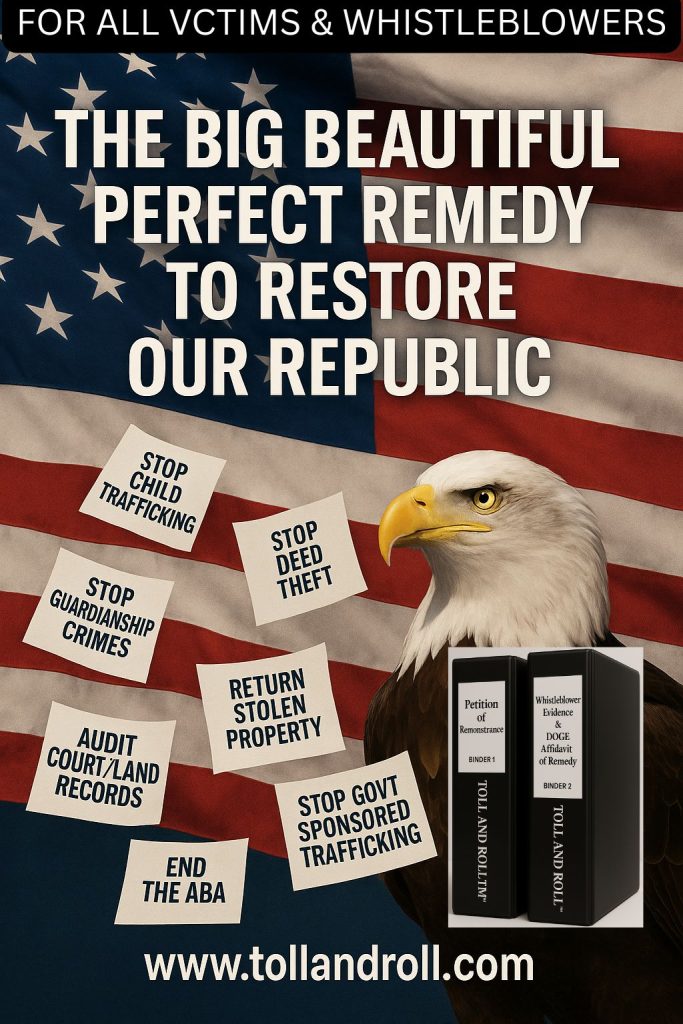 The Delegates seek the remedy for property titles being restored to rightful owners of title and for them to receive treble damages. They seek the return of children to their families and seniors to be taken out of isolation. Damages are tolling, hence the name Toll and Roll!